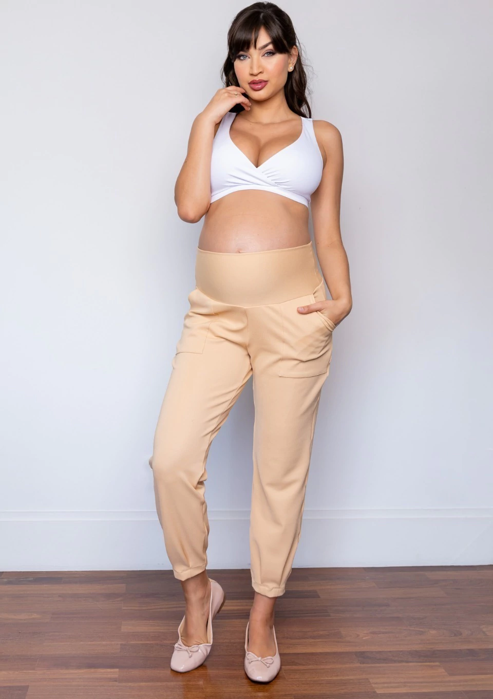 Possui bolsos utilitários na frente com recorte em alfaiataria, pregas nas barras e o já queridinho cós anatômico sem elásticos para acompanhar e ajustar o crescimento da barriga.