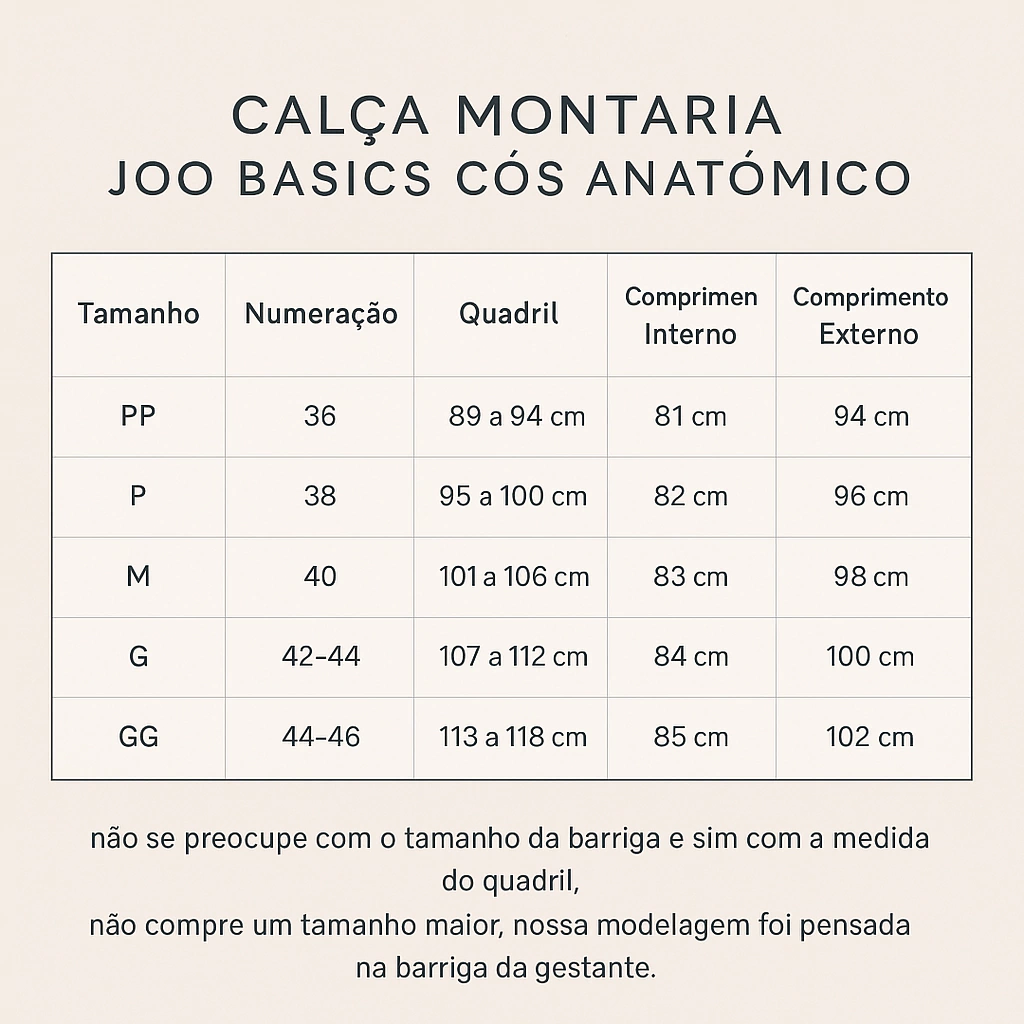 Nossa Calça montaria é a preferida das mamães, possui o cós anatômico, que é a nossa marca registrada e foi desenvolvida para gestantes e mulheres no pós parto que procuram um produto de qualidade e com tecnologia para proporcionar conforto, segurança para o dia a dia da mamãe e do bebê.